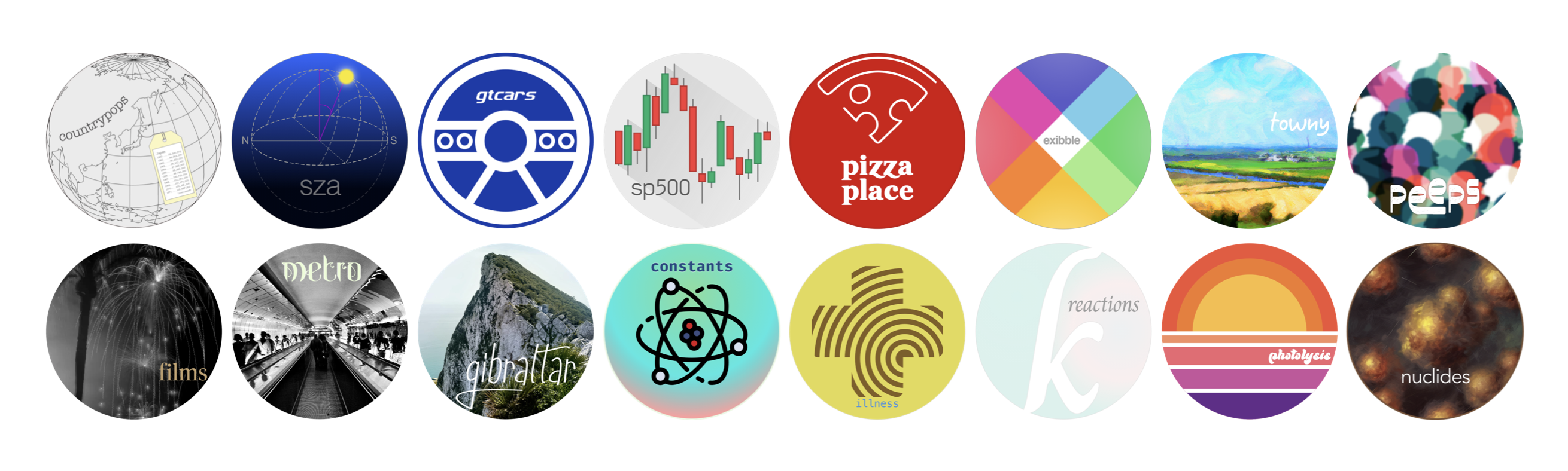 )There are 16 datasets provided by Great Tables: countrypops, sza, gtcars, sp500, pizzaplace, exibble, towny, peeps, films, metro, gibraltar, constants, illness, reactions, photolysis, and nuclides.